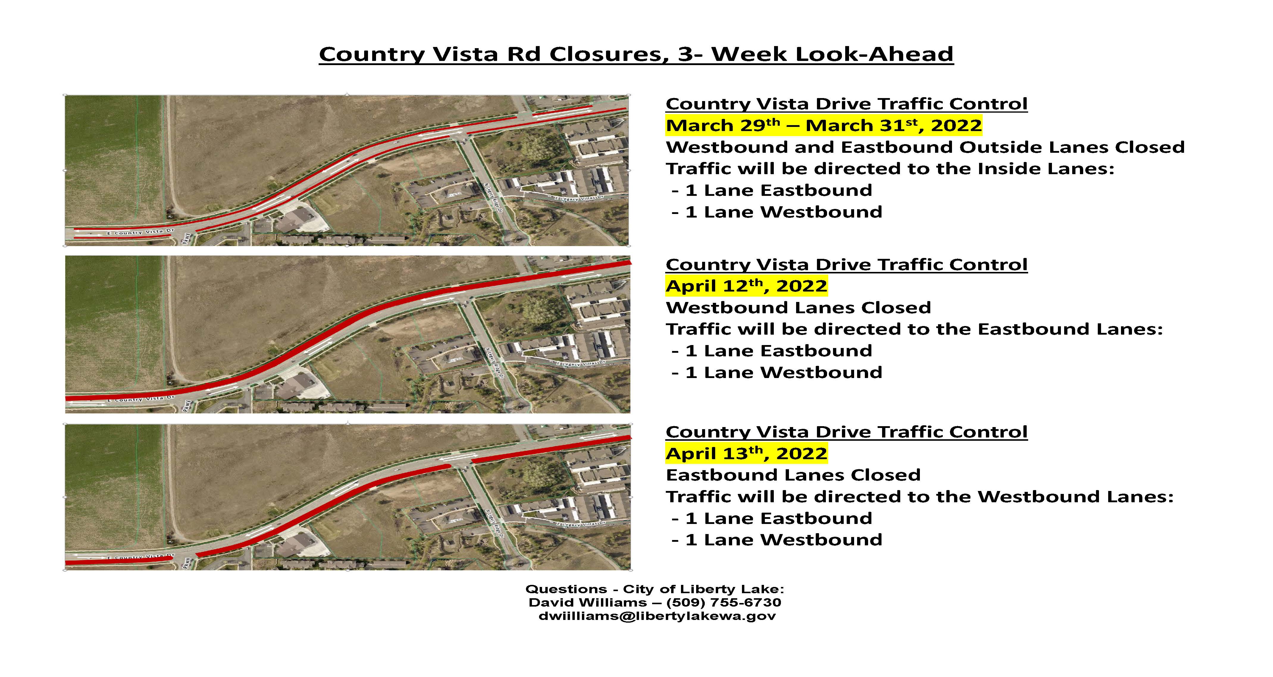 Liberty Lake Residents be aware of upcoming lane closures that will be occurring on E Country Vista Dr between the westside of Kramer Parkway and the eastside of Legacy Ridge Dr. Traffic control measures will be in place March 29th - March 31st and April 12th - April 13th.